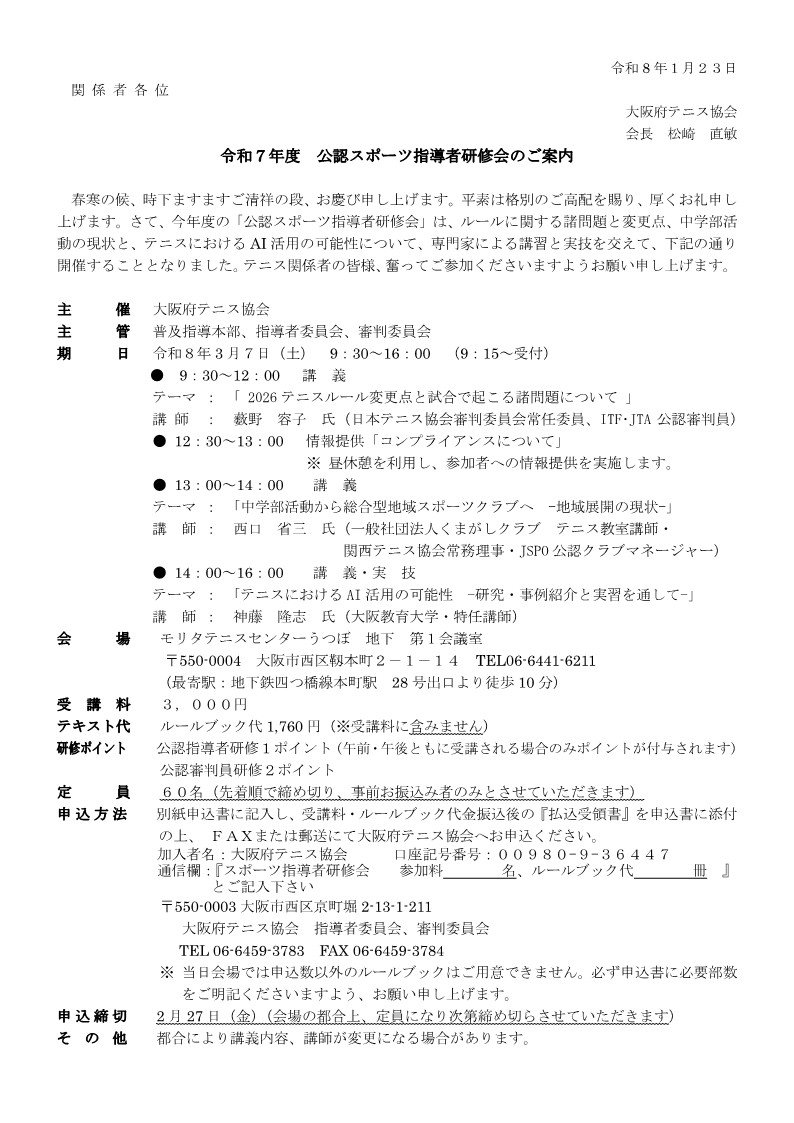 令和7年度日本スポーツ協会公認テニスコーチ1・2養成講習会