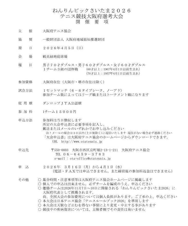 ねんりんピックさいたま2026 テニス競技大阪府選考大会